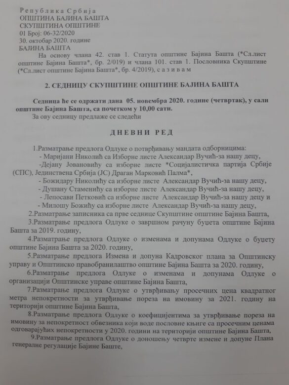 На почетку ће се потврдити мандати за пет одборника. Одборници ће разматрати завршни рачун општине Бајина Башта, предлог Одлуке о изменама и допунама Одлуке о буџету Општине за 2020. годину, измене Кадровског плана за Општинску управу, предлог Одлуке о утврђивању просечних цена квадратног метра непокретности за утврђивање пореза на имовину за 2021. годину, предлог Одлуке о коефицијентима за утврђивање пореза на имовину као и предлог Одлуке о доношењу четврте измене и допуне Плана генералне регулације Бајине Баште.