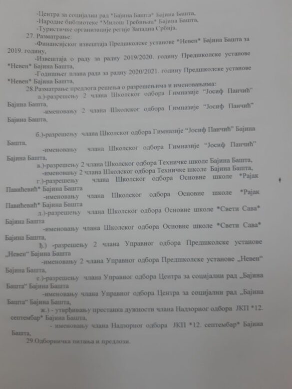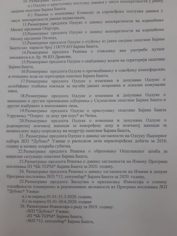 Одборници ће разматрати више предлога за давање у закуп непокретности, предлог Одлуке о приступању Бајине Баште Удружењу „ПОкрет за децу три плус“, извештају о раду Јавних предузећа и Установа за 2019. годину и већи број разрешења и именовања чланова Управних одбора установа и Школских одбора.