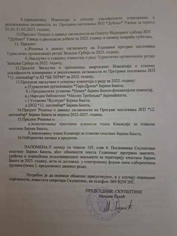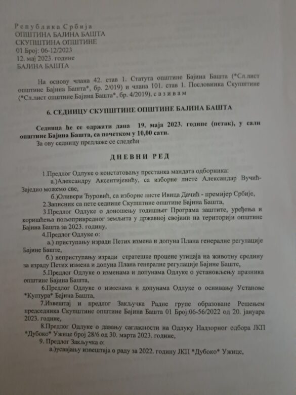 Одборници ће разматрати Одлуку о доношењу годишњег Програма заштите, уређења и коришћења пољопривредног земљишта у државној својини на територији општине Бајина Башта за 2023. годину и Предлог одлуке о приступању изради Петих измена и допуна Плана генералне регулације Бајине Баште.
