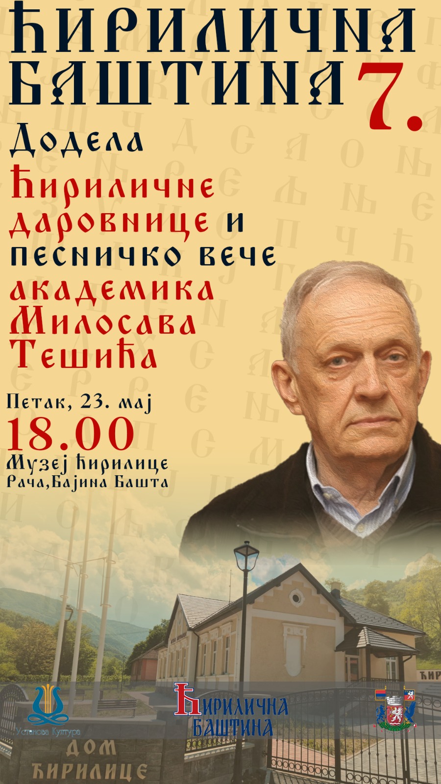 „Ћирилична даровница“ ће академику Милосаву Тешићу бити уручена у петак, 23. маја у Музеју ћирилице у Рачи. Приликом доделе „Ћириличне даровнице“ уважани академик, чије су бројне песме посвећене славним рачанским калуђерима, одржаће своје песничко вече. Песник који у збирци „Круг рачански, Дунавом“ приказује рачанско монаштво које се у Великој сеоби одселило али негује духовни континуитет са традицијом православног средњовековља и ради на очувању језика и националног бића своје стихове ће казивати у Музеју ћирилице који темељ свог постојања има баш у раду изузетних калуђера Рачана.