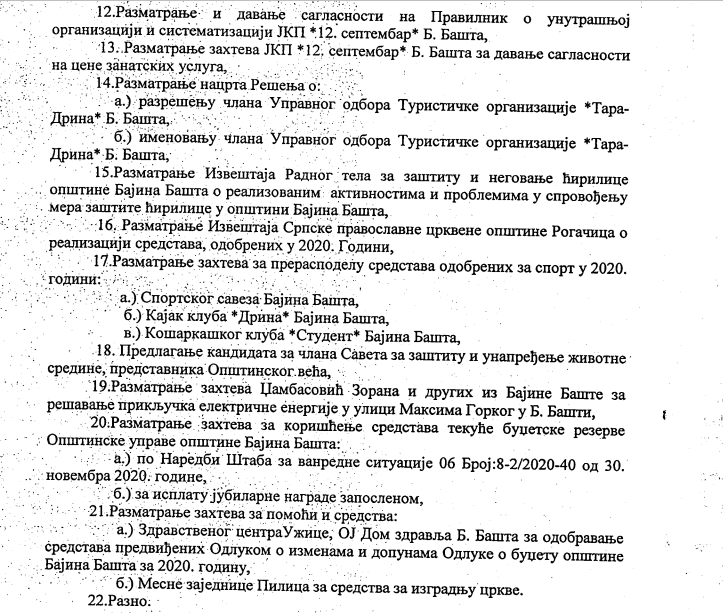 Већници ће на седници у понедељак разматрати Извештај Радног тела за заштиту и неговање ћирилице општине Бајина Башта о реализованим активностима и проблемима у спровођењу мера заштите ћирилице у општини Бајина Башта као и извештај Српске православне црквене општине Рогачица о реализацији одобрених средстава у 2020. години.