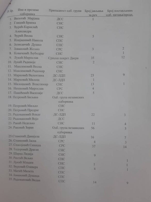 Раковић је на седници од 5. јуна тражио да се достави табела у којој ће се навести сви одборници у овом сазиву Скупштине, испред које су странке и да се поред сваког имена наведе колико се који одборник јавио за дискусију у последњих 10 седница Скупштине, колико је сваки одборник упутио одборничких предлога и колико је поставио одборничких питања. Ову више него занимљиву табелу можете погледати испод.