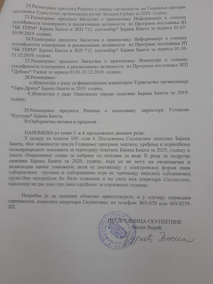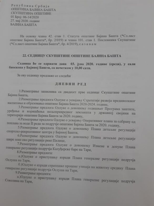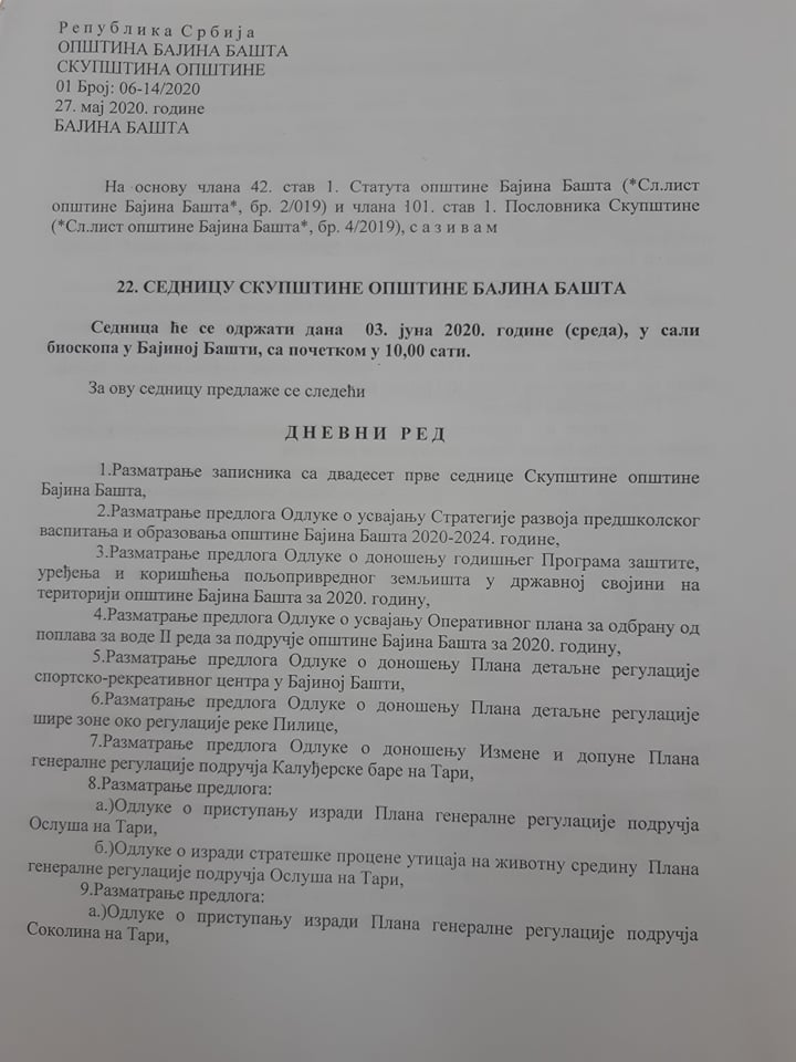 У среду, 3. јуна, ће се одржати 22. седница Скупштине општине Бајина Башта и то ће вероватно бити последња седница овог сазива локалног парламента. Због примене свих прописаних мера за заштиту од ширења вирса корона седница ће се одржати у сали биоскопа са почетком у 10 часова. За седницу је предложен дневни ред са чак тридесет тачки.
