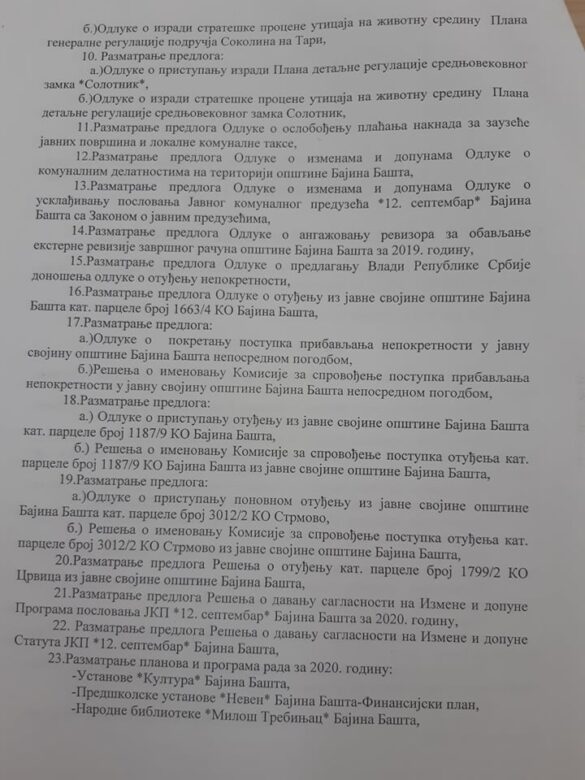 Одборници ће разматрати предлог оодлуке о усвајању Стратегије развоја предшколског васпитања и образовања општине Бајина Башта 2020-2024. године, одлуке о годишњем Програму заштите, уређења и коришћења пољопривредног земљишта у државној својини, већ број планова и измена и допуна планова детаљне регулације.