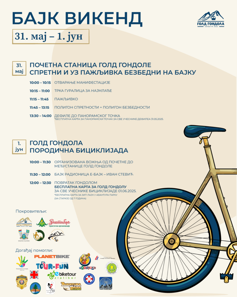 Јавно предузеће „Голд гондола Златибор“, уз подршку Општине Чајетина, Туристичке организације Златибор, Туристичко-рекреативног комплекса Златибор и ЈП „Безбедност саобраћаја Чајетина“, организује дводневни бициклистички догађај под називом „Бајк викенд“, који ће се одржати 31. маја и 1. јуна 2025. године.