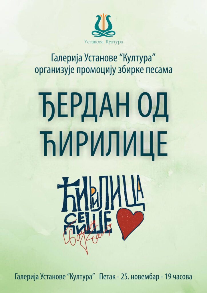 У петак, 25. новембра у 19 часова у галерији Установе „Култура“ биће одржана промоција збирке песама са конкурса „Чувари ћирилице“ који је организован у оквиру манифестације „Ћирилична баштина“ у мају ове године.