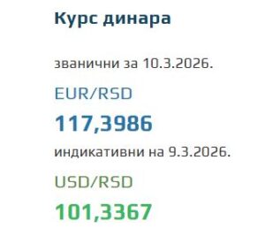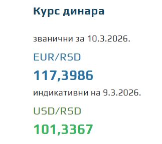 Званични средњи курс евра износи данас 117,3986 динара, што је незнатна промена у односу на понедељак, објавила је Народна банка Србије (НБС). Динар је у односу на евро нижи за 0,1 одсто у односу на пре месец дана, на годишњем нивоу је непромењен, а од краја претходне године је ослабио за 0,2 одсто.