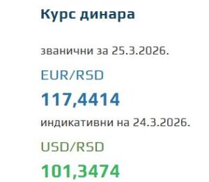 Званични средњи курс евра износи данас 117,4414 динара, што је незнатна промена у односу на уторак, објавила је Народна банка Србије (НБС). Динар је у односу на евро нижи за 0,1 одсто у односу на пре месец дана, на годишњем нивоу је непромењен, а од краја претходне године је ослабио за 0,2 одсто.