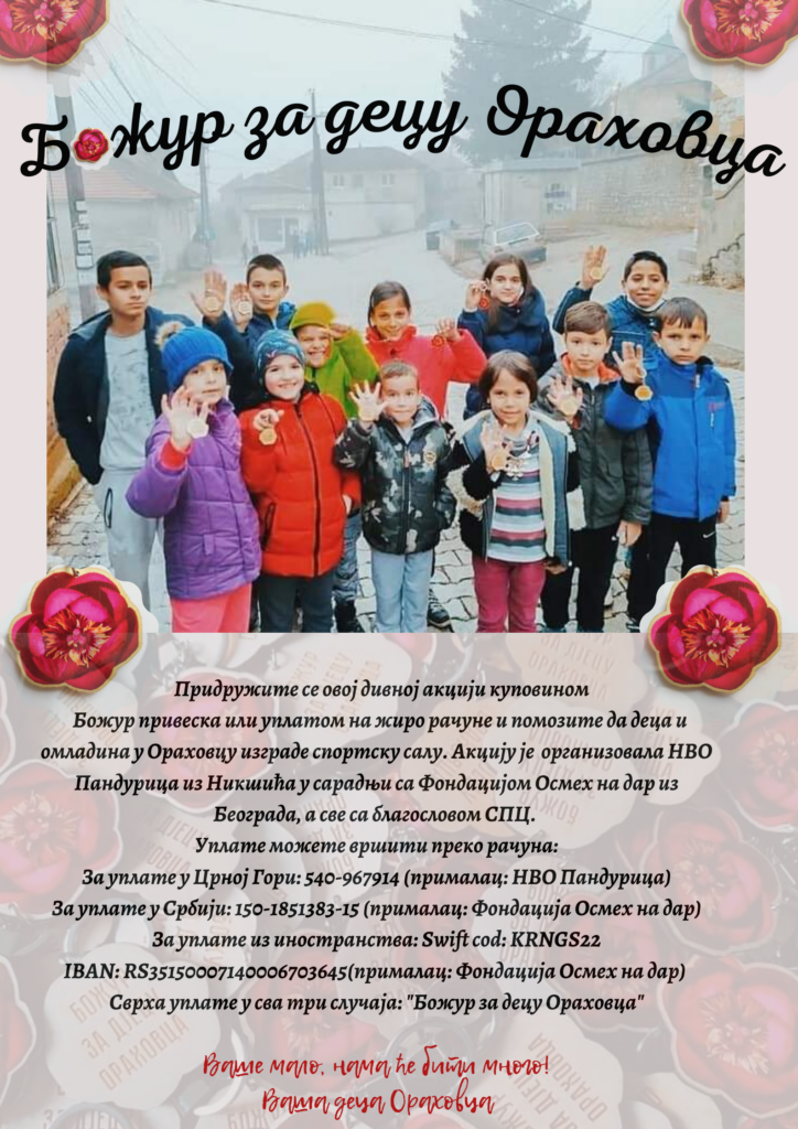 Акцију можете подржати и уплатом на динарски жиро рачун ХО „Осмех на дар“ 150-1851383-15 код Директне банке, уз назнаку „За децу Ораховца“.