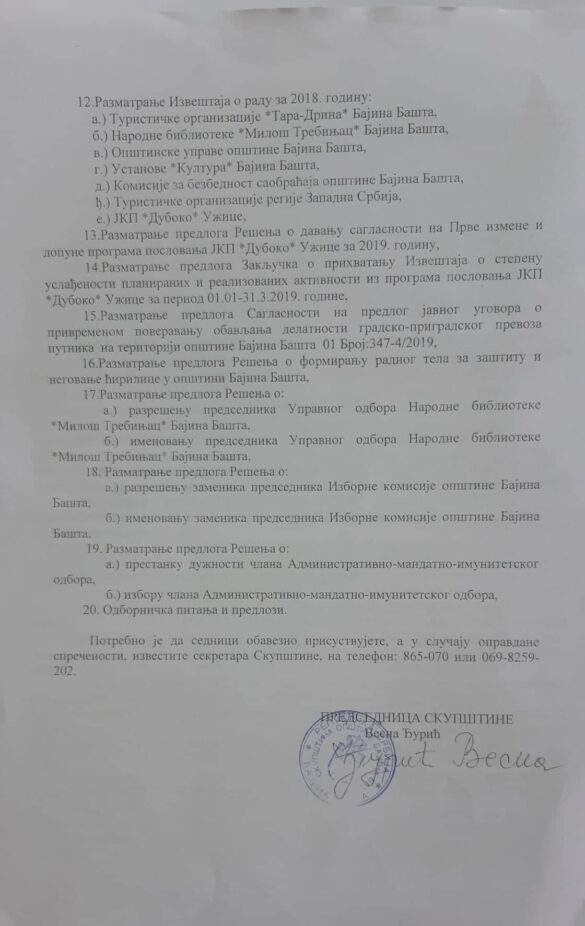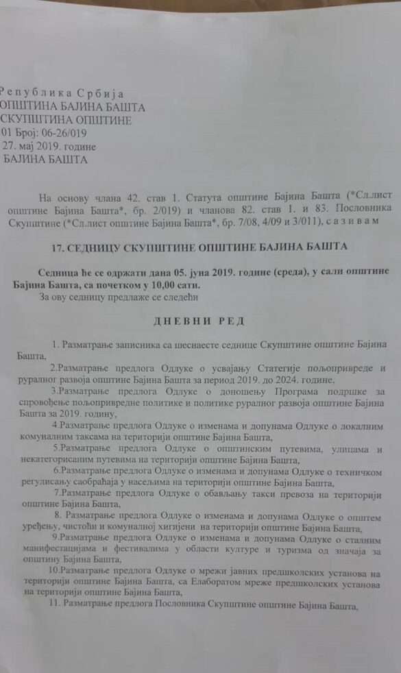 На 17. седници Скупштине општине Бајина Башта од избора овог сазива разматраће се предлози одлука о локалним комуналним таксама, одлуке о општинским путевима, одлуке о обављању такси превоза, одлуке о мрежи јавних предшколских установа…