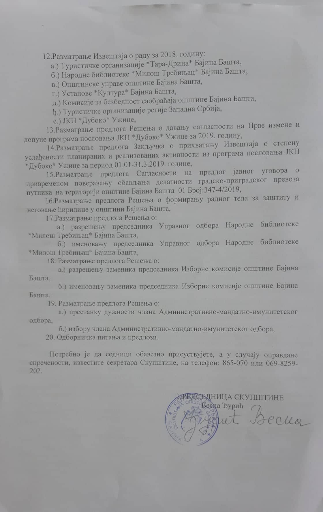 После тачно три месеца од претходне седнице Скупштине општине Бајина Башта нова седница је заказана за 5. јун. Пред одборницима ће се наћи 20 тачки дневног реда а поред извештаја о раду јавних предузећа и установа они ће разматрати програм пољопривреде, предлог новог Пословника и уговор о привременом поверавању јавног превоза путника на територији општине.