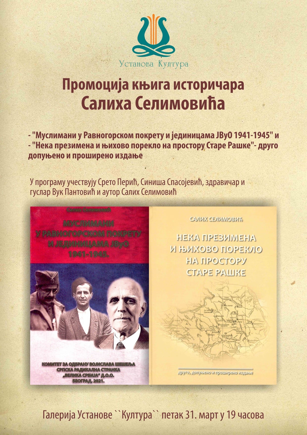 У петак, 31. марта, у галерији Установе „Култура“ у Бајиној Башти одржаће се промоција књига историчара, професора и публицисте Салиха Селимовића. Публици ће бити представљене књиге „Муслимани у Равногорском покрету и јединицама ЈВуО 1941-1945“ и „Нека презимена и њихово порекло на простору Старе Рашке“. У програму учествују Срето Перић, Синиша Спасојевић, здравичар и гуслар Вук Пантовић и аутор Салих Селимовић. Промоција почиње у 19 часова.
