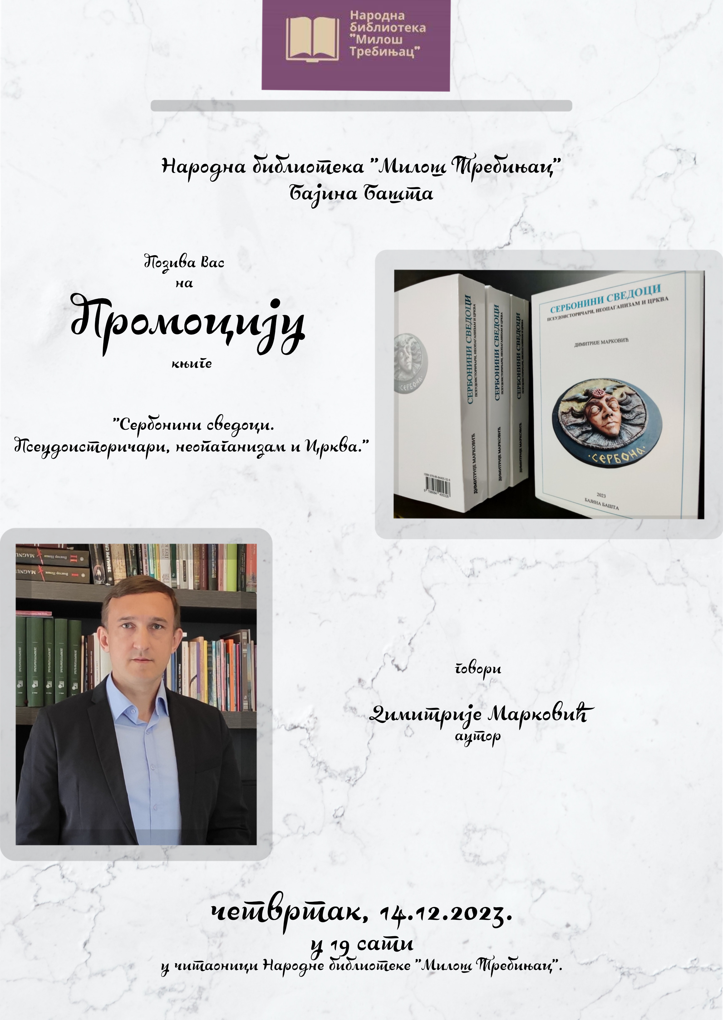 У четвртак, 14. децембра, у Народној библиотеци „Милош Требињац“ из Бајине Баште биће организована промоција књиге “Сербонини сведоци. Псеудоисторичари, неопаганизам и Црква” аутора Димитрија Марковића. Друго издање књиге чији издавач је Народна библиотека “Милош Требињац” представљено је и на овогодишњем 66. Међународном сајму књига у Београду. На промоцији књиге у читаоници бајинобаштанске библиотеке са почетком у 19 сати ће говорити аутор. Димитрије Марковић је православни публициста и хуманитарац из Бајине Баште.  Поред истрајне борбе против псеудоисторије широј јавности је познат и по томе што већ целу деценију заједно са пријатељима из Србије и Европе организује хуманитарне акције за српске породице на Косову и Метохији. Уз помоћ пријатеља прикупио је велику количину помоћи коју је током великог броја акција поделио бројним грађанима али и спортским у културним удружењима. Овом хуманитарцу тзв. Влада Косова је заједно са Ненадом Јеремићем забранила улазак у јужну српску покрајину због “деловања против суверенитета и националне безбедности Косова”.