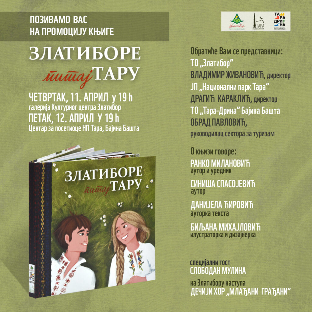 Туристичка организација „Тара-Дрина“ Бајина Башта, ЈП „Национални парк Тара“ и Туристичка организација „Златибор“ позивају вас на промоцију књиге „Златиборе питај Тару“ аутора Ранка Милановића, Синише Спасојевића, Данијеле Ћировић и Биљане Михајловић. Промоција ће се одржати у четвртак, 11. априла, у галерији Културног центра Златибор, а у петак, 12. априла, у Центру за посетиоце Националног парка „Тара“ у Бајиној Башти. Обе промоције почињу у 19 часова, а специјални гост на промоцијама биће чувени Слободан Мулина који је својим извођењем прославио познату песму Михаила Ћуповића „Златиборе питај Тару“. На Златибору ће програм увеличати и наступ Дечијег хора „Млађани грађани“.