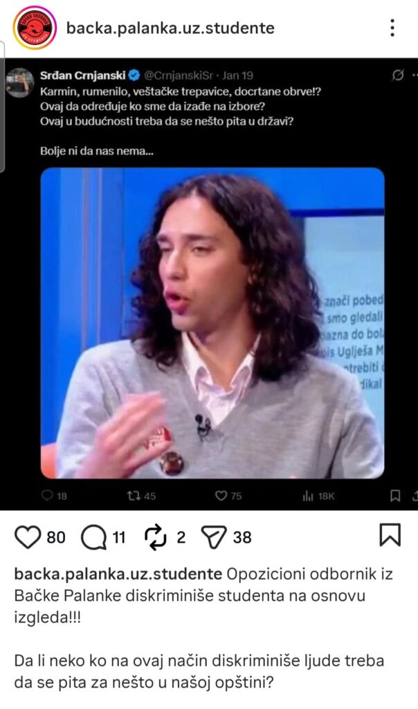 Реакција је била бурна. Инстаграм страница „Бачка Паланка уз студенте“, позната као противник власти, пренела је објаву уз поруку да опозициони одборник дискриминише студенте на основу изгледа.
