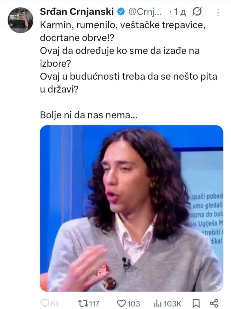 „Кармин, руменило, вештачке трепавице, доцртане обрве? Овај да одређује ко сме да изађе на изборе? Овај у будућности треба нешто да се пита у држави? Боље ни да нас нема…“