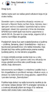 Питамо се, одакле се сада, неколико сати пред концерт, Тонију Цетинском, својевремено оптуженом за трговину потврдама о вакцинацији против Ковида, јавила потреба за писањем оваквог поста на друштвеним мрежама?