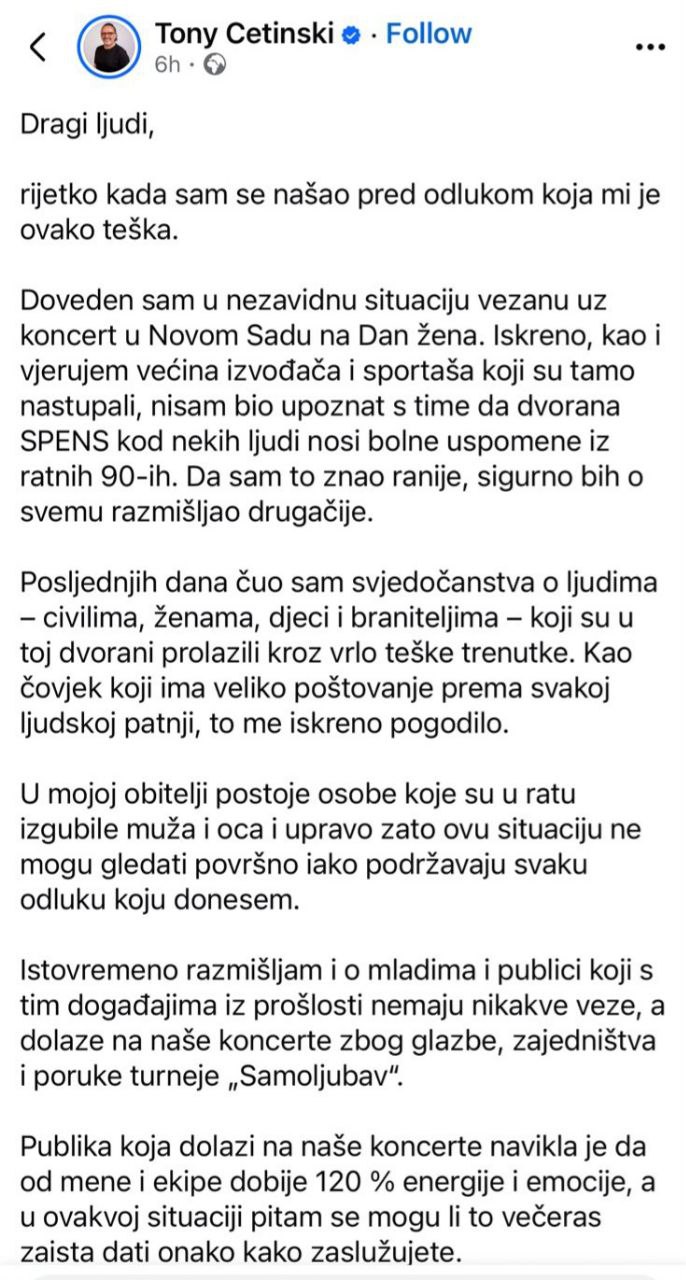 А Новосађанима, неколико сати пре концерта, топло препоручујемо да прочитају пост Тонија Цетинског и добро размисле на чији концерт иду. Највише због самопоштовања и поштовања према сопственом народу.