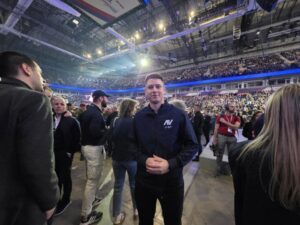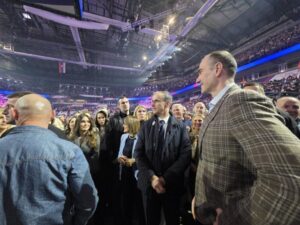 Народ је скандирао „Вучић Александар“ док је Вучић улазио у Арену. Хала је буквално крцата и нема где игла да падне.