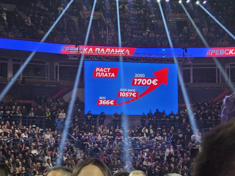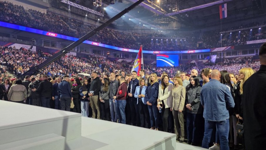 Почео је велики скуп СНС у Арени, а велики број људи је остао испред. Енергија је јака, а народ скандира Вучићу.