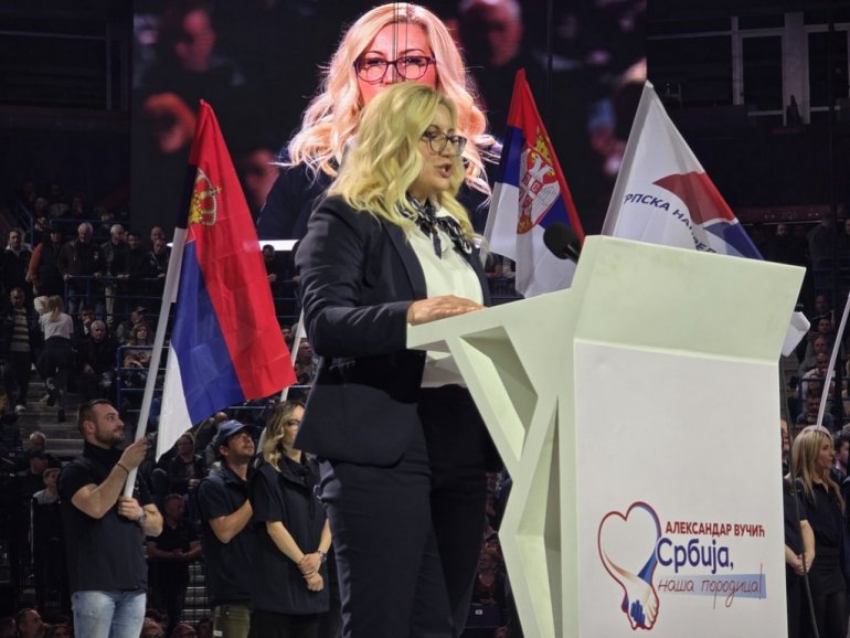 – Драги моји људи, кад стојим овде испред вас, осећам се као у својој породици. Знам да сам међу добрим људима, они који чувају своју земљу и воле и поштују своје жене, мајке, сестре и који брину о својој деци. Мој Гаврило ће ускоро напунити годину дана. Славићемо његов први рођендан срећни што га имамо здравог и напредног. Све што сам икад радила радила сам за њега и његову будућност. Данас овде стојим, не да бих се присетила како сам га могла изгубити у насиљу прошле године, не стојим како бих се присећала како су нам разарали земљу, вређали нас најгоре, палили нам странку, то смо победили, већ стојим због Гаврилове будућности. То зависи од избора који данас направимо. Ако данас будемо бирали добро, добро ће нам и бити. Ако данас будемо градили, сутра ће наша деца имати још снажнију земљу. Србија будућности у коју нас води наш председник Александар Вучић – казала је она.